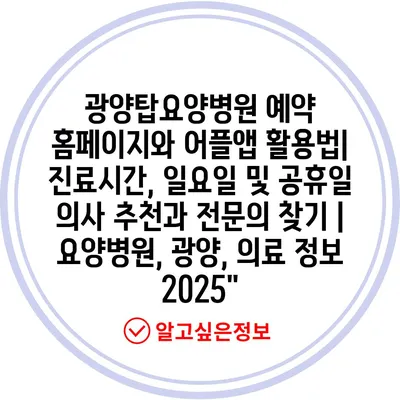 광양탑요양병원 예약 홈페이지와 어플앱 활용법| 진료시간, 일요일 및 공휴일 의사 추천과 전연락 찾기 | 요양병원, 광양, 의료 정보 2025″ 에 대해 자주 묻는 질문 TOP 5