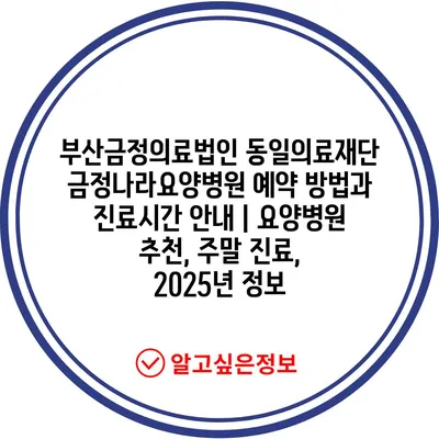 부산금정의료법인 동일의료재단 금정나라요양병원 예약 방법과 진료시간 공지 | 요양병원 추천, 주말 진료, 2025년 정보 에 대해 자주 묻는 질문 TOP 5